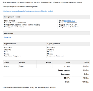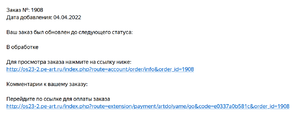 - Возможность использования инструкции к оплате в письме о заказе (использование переменных таких как «номер заказа», «ссылка на оплату», «сумма заказа», «комиссия» и html тегов)