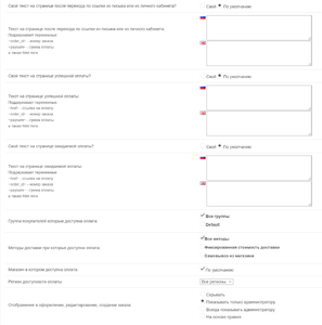 - Выбор страницы возврата успешной и неудачной оплаты (от модуля или стандартная от магазина - поможет для шаблонов без стандартных стилей)