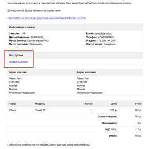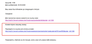 - Возможность использования инструкции к оплате в письме о заказе (использование переменных таких как «номер заказа», «ссылка на оплату», «сумма заказа», «комиссия» и html тегов)