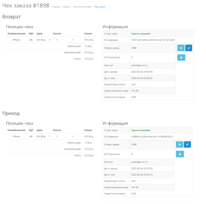 - Отображение чеков прихода и возврата с перечнем позиций в админ панели.