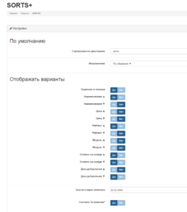- список сортировок: Заданная в товарах, Наименование, Цена, Рейтинг, Модель, Остаток на складе и Дата добавления;