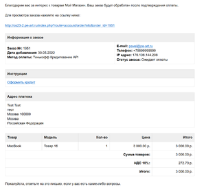 - Возможность использования инструкции для офрмления кредита при оформлении заказа (использование переменных таких как «номер заказа», «ссылка на оплату», «сумма заказа», «комиссия» и html тегов)