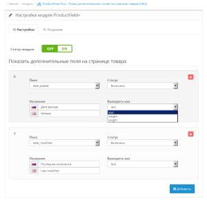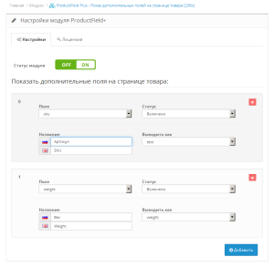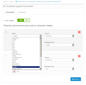 - модуль автоматически определяет все существующие поля в таблице product и позволяет вывести любое из них в виде обычного текста либо в формате веса или размера