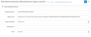 Модуль позволяет обновлять курс валют с сайтов ЦБ РФ (cbr.ru), НБ РБ (nbrb.by), Европейский ЦБ (ecb.int). Использует стандартный функционал обновления раз в сутки при заходе на главную админ панели, а также возможность ручного обновления из списка валют и имеет уникальную функцию обновления по расписанию через cron в любое время