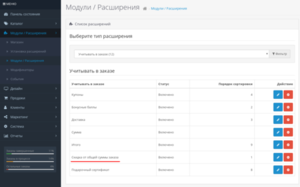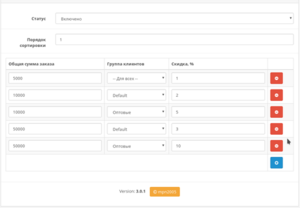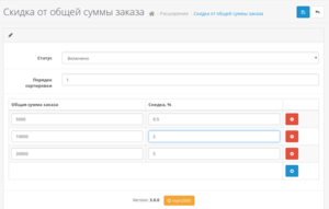 Модуль позволяет установить для магазина произвольное количество скидок, которые будут зависеть от общей суммы заказа. Скидки применяются автоматически, по достижении необходимой суммы в корзине.