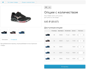 - "Ввод количества (с разделением на товары в корзине)" - Поля ввода количества. При добавлении в корзину опции разделяются на отдельные товары.
