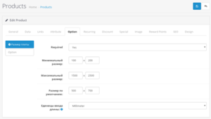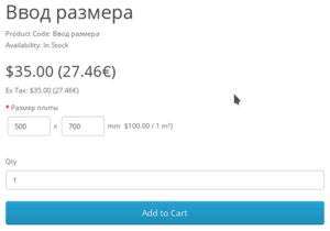 - "Ввод размера (цена за площадь)" - Цена за квадратную единицу указывется в цене товара (Единицы длины указываются в товаре). У опции указывается единицы ввода длины ии при расчёте цены производится перевод в единицы товара. Дополнительно есть настройки: минимального размера, максимального размера и размера по умолчанию.