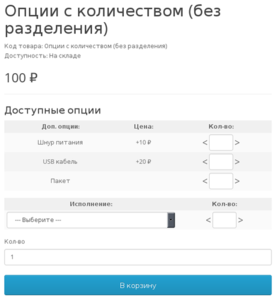- "Ввод количества" - Поля ввода количества. При добавлении в корзину опции не разделяются на отдельные товары.