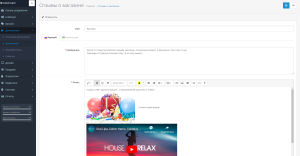 - Так же у администратора магазина есть возможность, ответить на отзыв. При чём ответ может содержать не только текст, но и изображения, видео итп, так как используется полноценный текстовый редактор.