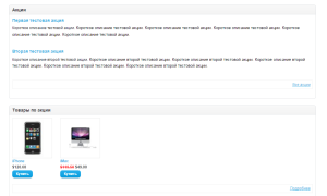 - Описания акций отображаются подобно новостям: модуль с анонсами, страница с полным списком и отдельная страница описания акции