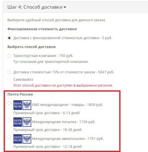 • В модуле учитывается вес заказа, то есть для заказов 50 г - будут отображаться письма, для заказов до 2 кг - будут отображаться только способы отправки различного вида бандеролями (те которые отмечены галочками), для заказов более 2 кг и менее 20 кг будут отображаться только способы доставки посылками. Посылки весом больше 20 кг Почта России не отправляет, так что такие заказы нужно разбивать на несколько, если, конечно, это возможно.