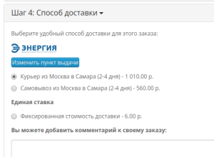 - отображение у вариантов доставки: логотипа, срока доставки, города отправления, города доставки, адреса выбранного ПВЗ, кода выбранного ПВЗ