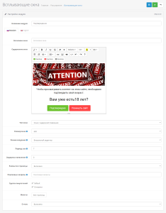 - тип окна: с задержкой / при уходе / уведомление о cookie