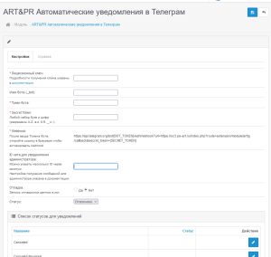 Модуль позволяет задать индивидуальный текст для каждого статуса заказа раздельно для нового и смены статуса, а также отдельный текст для администраторов (для администраторов возможно задать несколько аккаунтов)