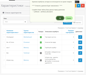 - удаление выбранных атрибутов из всех товаров с этими атрибутам (отвязка от товаров) с удалением самих выбранных атрибутов