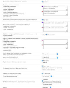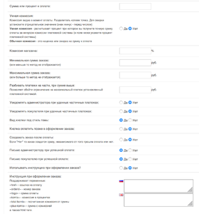 - Возможность использования инструкции к оплате при оформлении заказа (использование переменных таких как «номер заказа», «ссылка на оплату», «сумма заказа», «комиссия» и html тегов)