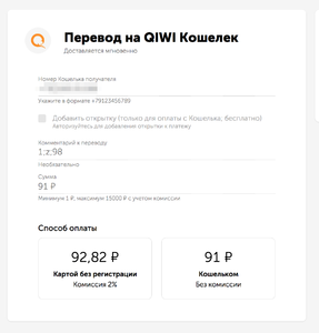 Комиссия банковских карт 0-2% и 0% киви кошелек(информация не является офертой и зависит только от qiwi). Более того Вы можете самостоятельно установить комиссию или скидку.