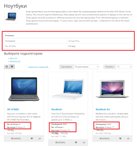 - Вывод в каталоге/категориях, поиске, в различных модулях, на странице производителя, в акционных товарах и т.д. в карточках товаров артикула и тех характеристик/атрибутов, которые заполнены у категории товара.
