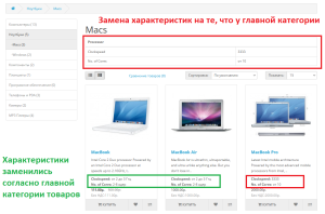 - В модулях выводятся те характеристики, которые указаны у главной категории товара. На странице категории выводятся всегда те характеристики, которые прописаны у этой категории.