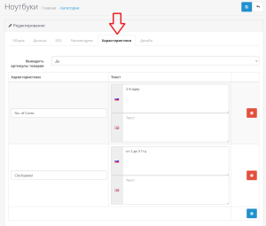 - Заполнение характеристик к каждой категории(по аналогии с товарами), включая их значения.
