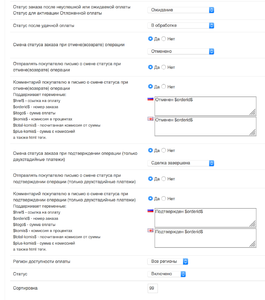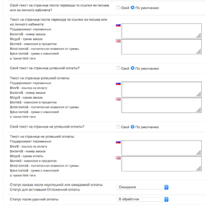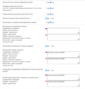 - Возможность использования инструкции к оплате при оформлении заказа (использование переменных таких как «номер заказа», «ссылка на оплату», «сумма заказа», «комиссия» и html тегов)