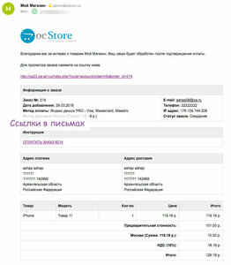 - Возможность использования инструкции к оплате в письме о заказе (использование переменных таких как «номер заказа», «ссылка на оплату», «сумма заказа», «комиссия» и html тегов)