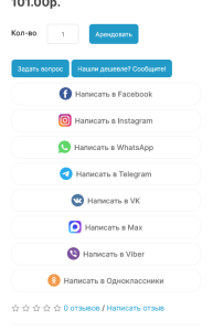 Модуль «Связаться в мессенджере» добавляет в карточку товара кнопки связи через популярные мессенджеры и социальные сети: Telegram, Max, WhatsApp, Viber, Instagram*, Facebook*, VK, Одноклассники.
