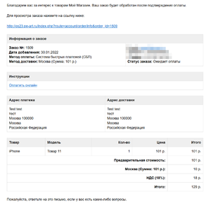 - Возможность использования инструкции к оплате в письме о заказе (использование переменных таких как «номер заказа», «ссылка на оплату», «сумма заказа», «комиссия» и html тегов)