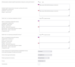 - Возможность использования инструкции к оплате при оформлении заказа (использование переменных таких как «номер заказа», «ссылка на оплату», «сумма заказа», «комиссия» и html тегов)