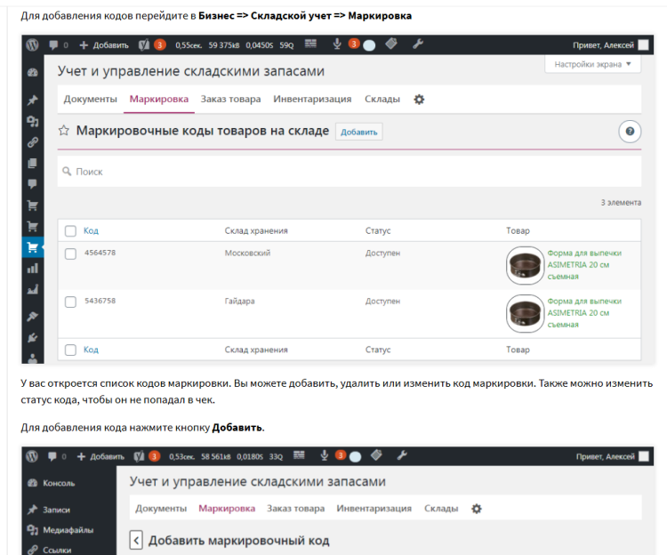 q3dm0 Опубликовано 28.07.2025 в 14:51 Поделиться Опубликовано 28.07.2025 в 14:51 Для работы с товарами, подлежащими обязательной маркировке, в табличной части документа добавляется поле "Код маркировки", в него нужно сканировать коды "Честного знака" с товара при продаже. Эти коды будут передаваться в фискальный регистратор (убедитесь, что прошивка вашего фискального регистратора уже обновлена до версии, поддерживающей работу с маркировкой). Обратите внимание, что если вы продаете несколько единиц маркированного товара, необходимо добавлять их в документ несколькими строками по 1 штуке. Если маркировка принимается фискальным регистратором корректно, на электронном чеке после названия товара будет выводиться код маркировки, а на бумажном буква [M]. На странице "Финансы-Фискальный регистратор" есть кнопка для проверки корректности кода маркировки на товаре. Подробнее Для добавления поля следуйте инструкции ниже или напишите нам. 1. Выполните SQL-запрос (это можно сделать через /admin/phpmyadmin/): ALTER TABLE `wn_scif1_doc_det` ADD `gs1` VARCHAR( 128 ) NOT NULL DEFAULT ""; 2. Добавьте в файле настроек wn_settings.php в корне установки системы (файл можно редактировать из меню Редактор кода) следующий код: $docitem_userfields['gs1']=array('name'=>'Код маркировки'); https://www.webnice.biz/faq-scif/?q50&ysclid=mdn83czjum710575146 если будете просто вставлять нное количество символов, просто можно под заказ сделать доработку, что то типо того как сверху описывается или под заказ делать отдельно модуль 0 Цитата Ссылка на комментарий Поделиться на другие сайты Поделиться