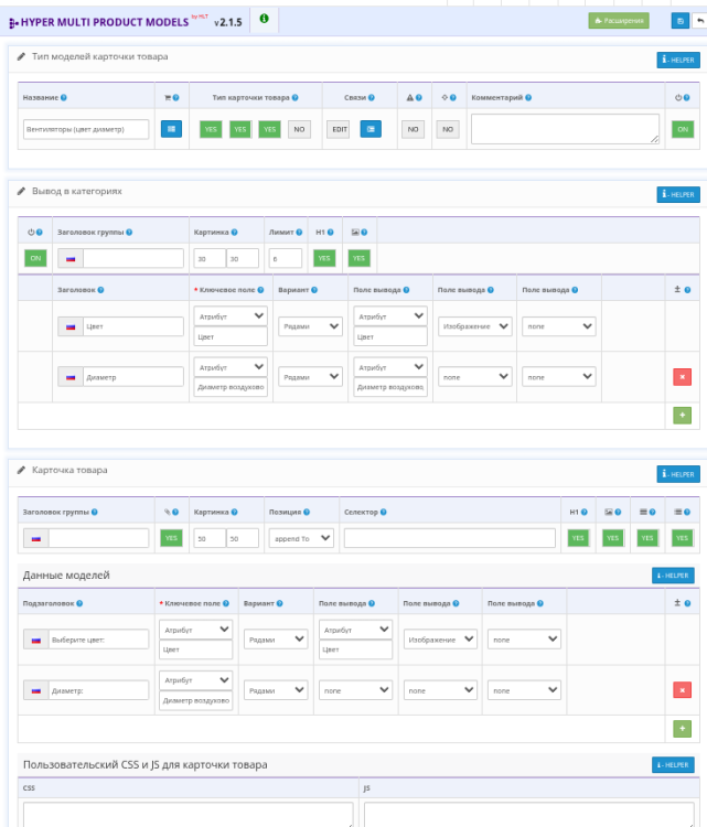 После этого нужно настраивать для конкретных категорий и связок параметры вывода. Это делается в настройках модуля. Там указываете для каждой отдельной категории свои параметры для вывода связи на фронте магазина.