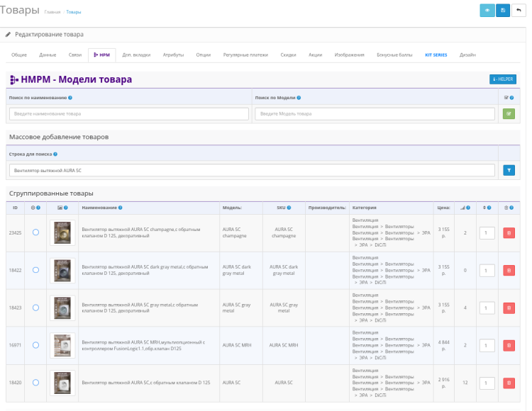 Первый шаг настройки - объединить товары в группу на закладке HPM у товара.