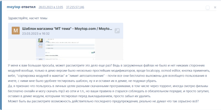 freeworld Опубликовано 12.04.2023 в 14:06 Поделиться Опубликовано 12.04.2023 в 14:06 В 12.04.2023 в 16:46, moytop сказал: Правила пользования площадкой прописаны на самой площадке https://opencart.club/info/. В этих правилах нет ни одного пункта который я нарушил, но мало ли я могу и заблуждаться, пришлите в этом случае скрин или выдержку из конкретного правила, которое я нарушил. А всё остальное, я согласен - из пустого в порожнее, просто мнение людей, что по их мнению я плохой, а они хорошие ) Цитата 8. Правила распространения Дополнений. 8.6. Разработчику запрещено размещать и распространять Дополнение в случае, если он не является его автором. Вот что вы нарушили, это как раз таки про варез, при чем вас однажды уже предупредили как выше писали, и вы это предупреждение получили по всей видимости только потому, что использовали варез на своих ресурсах и ссылались на него используя эту площадку! Думаю, знала бы администрация всё вышеперечисленное коллегами как вы там рекламировали варез и всё остальное, вам и этого шанса не дали.Администрации стоит внести пояснения к пункту 8.6 условий соглашения опираясь на данный прецедент, меньше вопросов будет к условиям соглашения пытаясь таким образом обойти правила. 0 Цитата Ссылка на комментарий Поделиться на другие сайты Поделиться
